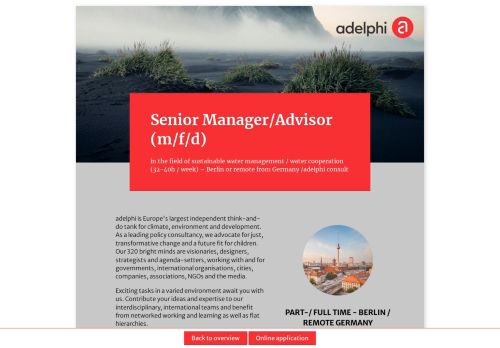 adelphi is looking for a Senior Advisor/Manager to support their water programme, working in full-time (or 32h/week) at our Berlin office or working remotely from other places in Germany.