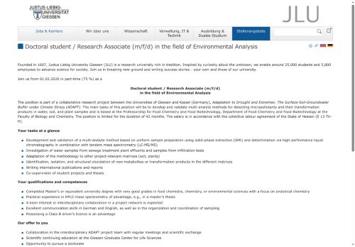 The position is part of a collaborative research project between the Universities of Giessen and Kassel (Germany), Adaptation to Drought and Extremes: The Surface-Soil-Groundwater Buffer under Climate Stress (ADAPT).