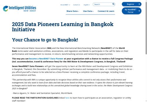 Your Chance to go to Bangkok! The International Water Association (IWA) and the New International Benchmarking Network (NewIBNET) of the World Bank invite water and sanitation utilities, associations, and regulators worldwide to participate in the call for data on their performance and management to receive, in return, benchmarking services and networking opportunities.