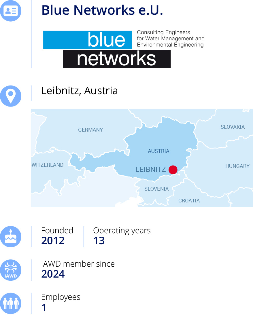 The Danube region, with its beautiful landscapes, impressive cities, and wonderful people, is very close to my heart. At the same time, the water sector in this region faces major challenges, particularly in the areas of asset management, water losses, and rehabilitation planning. Blue Networks offers expertise in these areas. The IAWD offers an excellent network for exchanging experiences and establishing contact with water suppliers and experts from the region, which is entirely in line with my networking philosophy.